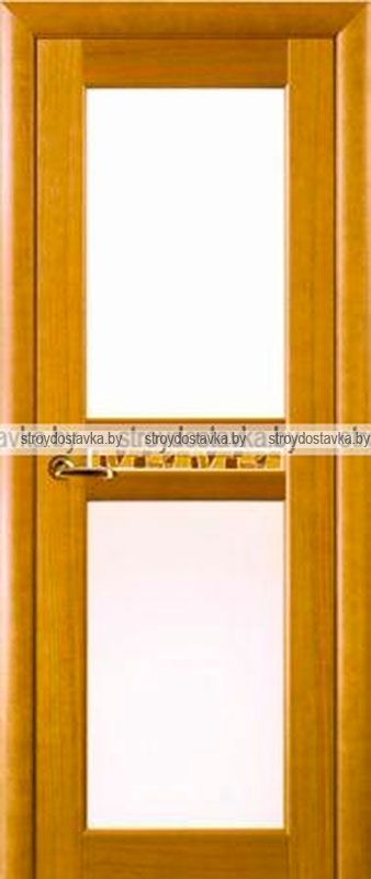 Дверь межкомнатная имеет две остекленные секции. Каркас двери изготавливается из переклеенного массива древесины хвойных пород, облицованного МДФ и шпоном ангери. Филенка межкомнатной двери изготавливается из плиты МДФ облицованной шпоном ангери. Раскладка и рамка межкомнатной двери изготавливаются из переклеенного массива древесины хвойных пород и облицована шпоном ангери. Рамка межкомнатной двери цельная, что позволяет устанавливать цельное стекло. Все элементы двери отделаны двухкомпонентным лаком «AKZO NOBEL». Габаритные размеры межкомнатной двери: 600/700/800/900 х 2000 (мм). Толщина межкомнатной двери: 40 (мм).