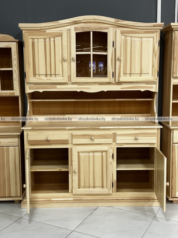 Буфет "Карлит" МД-377 используется для хранения посуды, с рабочей поверхностью для разделки пищи. Изготавливается из массива сосны покрытого бесцветным лаком, либо белым воском. На заказ изготавливается в крашении: белое масло, серое масло, орех, либо комбинации цветов. Поставляется в разобранном виде.
