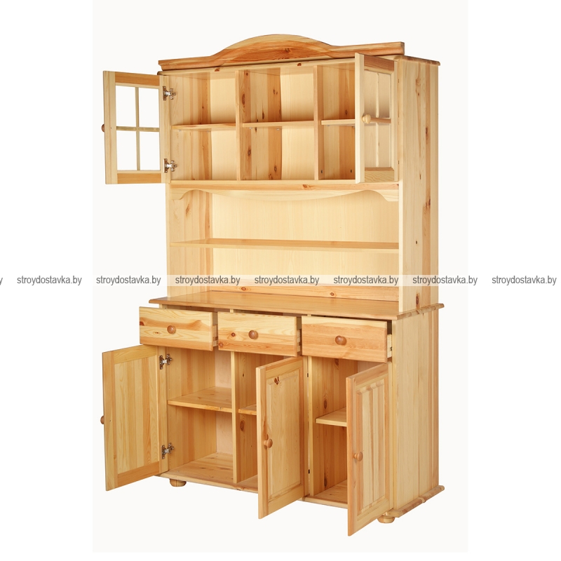 Буфет "Пиренея" МД-379М используется для хранения посуды, с рабочей поверхностью для разделки пищи. Изготавливается из массива сосны покрытого бесцветным лаком, либо белым воском. Поставляется в разобранном виде.