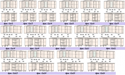 Угловые наборы Мила включают в себя: линейку 1,2м глубиной от 1,2м до 2,6м шириной и линейку 1,4м глубиной от 1,2м до 2,6м шириной. Доукомплектовать можно линейными(прямыми) вариантами “Мила АРТ” предоставленым наборами от 0,9м до 2,6м, а так же НШ60д (Шкаф под духовку), ВШГ50 (Шкаф под вытяжку шириной 50), ВШГ60 (Шкаф под вытяжку шириной 60), завершающими модулями формы трапеции: ВПз30, НПз30(Левый) и НПз30(Правый), пеналом НШП№2 шириной 40.