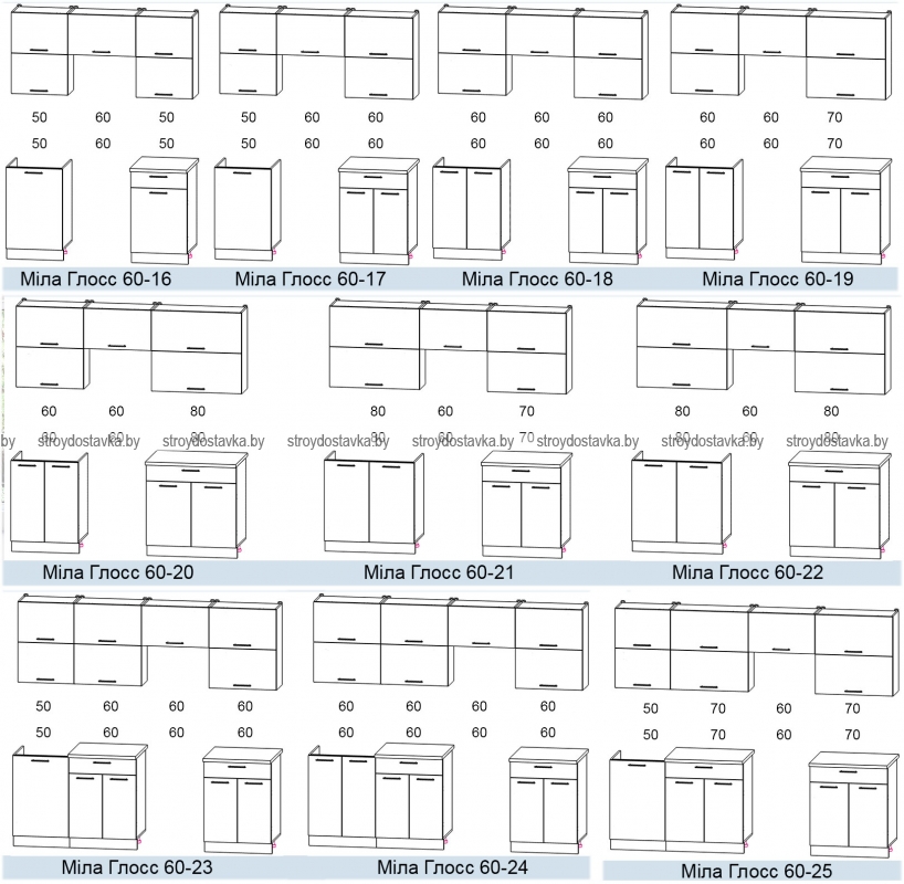 Линейный ряд кухни “Мила Глосс” предоставляет выбор набора от 1,6м до 3,0м с учетом газовой плиты 60см. Угловые кухни размером 1,18м по короткой стороне и от 1,2м до 2,6м по длинной стороне, кратно 0,1м. Стандартные комплектации рассчитаны под использование отдельностоящей или встраиваемой духовки (0,6м) и отдельностоящей духовки (0,5м).
