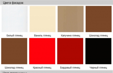 Из цветов фасадов на выбор есть глянцевые: Белый, Ваниль, Капучино, Шоколад, Красный, Бордовый, Чёрный. Профиль фасадов Модерн 3.