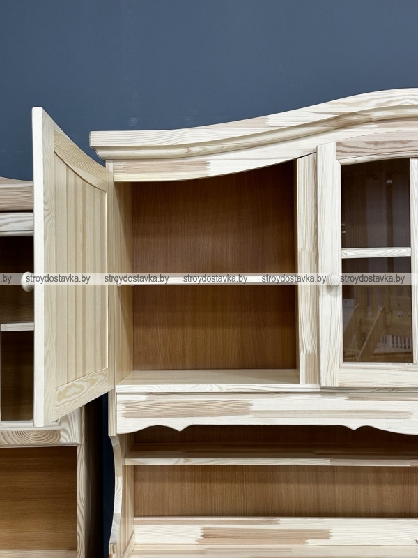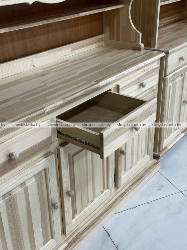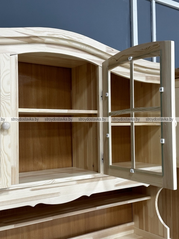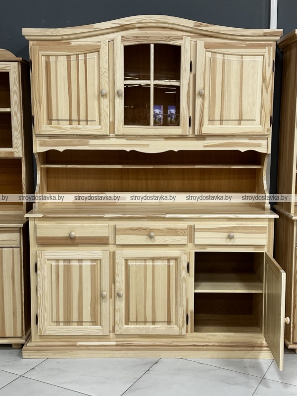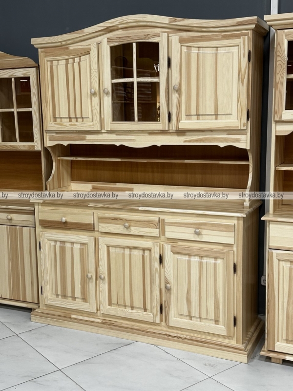 Буфет "Карлит" МД-377 используется для хранения посуды, с рабочей поверхностью для разделки пищи. Изготавливается из массива сосны покрытого бесцветным лаком, либо белым воском. На заказ изготавливается в крашении: белое масло, серое масло, орех, либо комбинации цветов. Поставляется в разобранном виде.